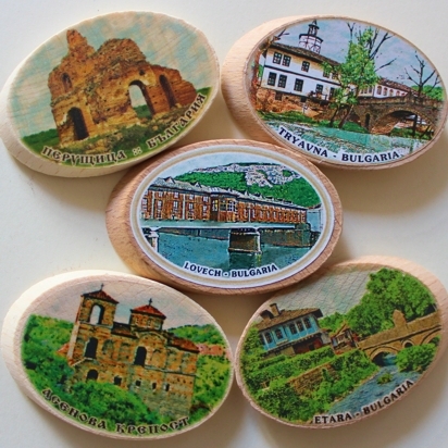 Дървените Сувенири, Модел 08-7, имат елипсовидни и нестандартни заоблени форми, с големина 35-36 кв.см. и добавени вградени Компаси. Гърбовете са магнитни. Разполагаме с изображения за почти всяко населено място.
