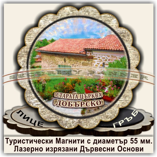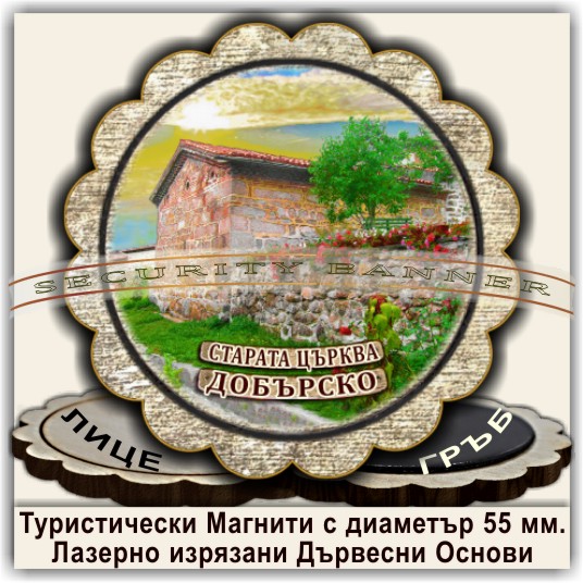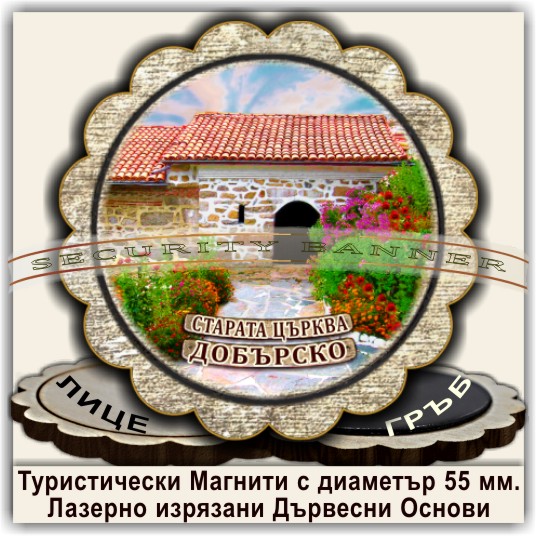 Магнитни сувенири, Модел 08-3, с изгледи от Добърско. Лазерно изрязани основи от дървесни плоскости /шперплат/, с диаметър 55 мм. Разполагаме с разнообразни изображения от Добърско, но можем да ги направим и с Ваши снимки и проекти.