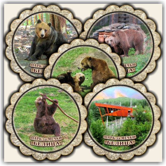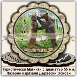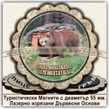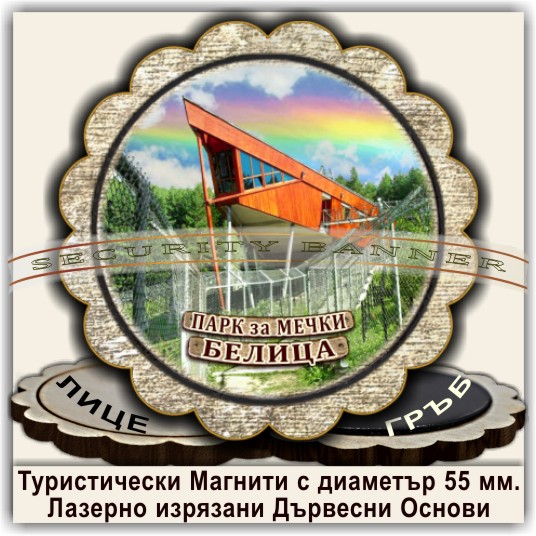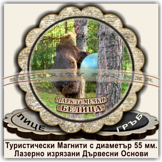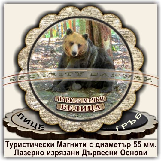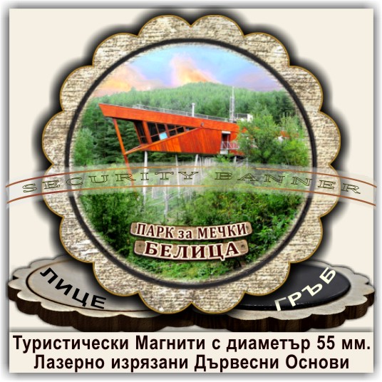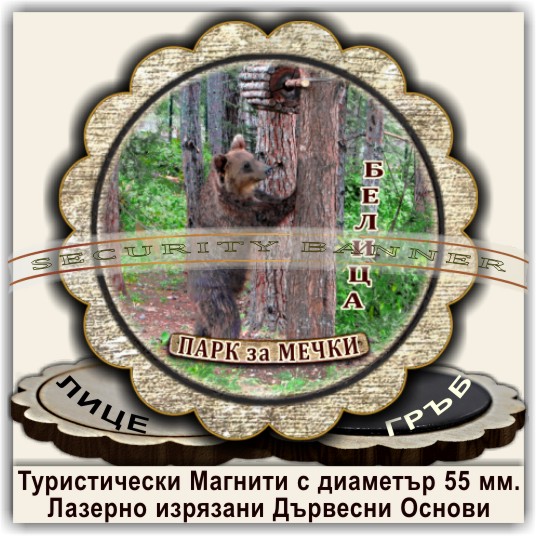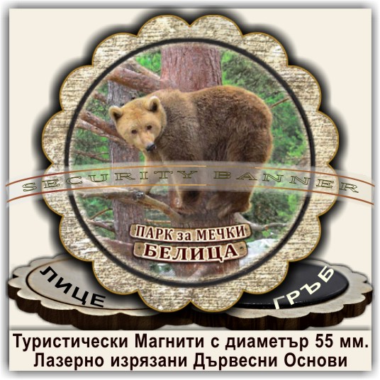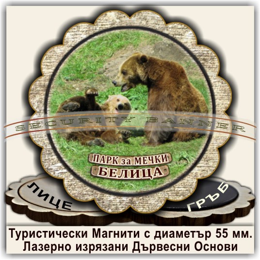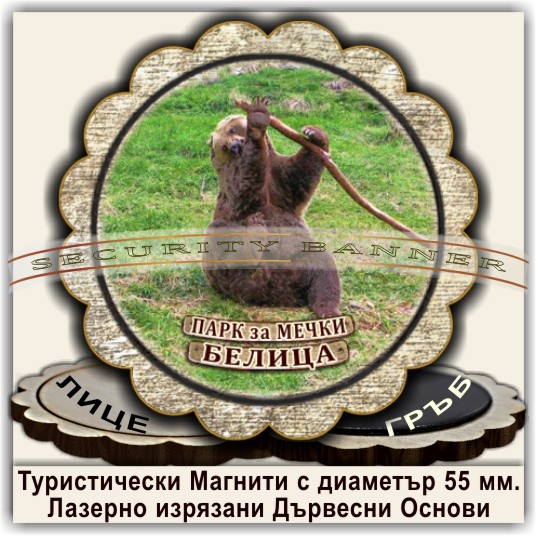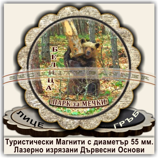 Магнитни сувенири, Модел 08-3, с изгледи от Белица и Паркът за танцуващи мечки. Лазерно изрязани основи от дървесни плоскости /шперплат/, с диаметър 55 мм. Разполагаме с разнообразни изображения от Белица и Паркът за мечки, но можем да ги направим и с Ваши снимки и проекти.
