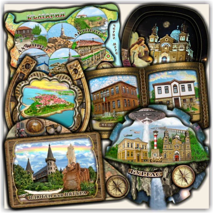 Разнообразни сувенири с изгледи от Бургас, Айтос, Ахтопол, Царево, Дюни, Елените, Китен, Малко Търново, Несебър, Обзор, Защитена местност "Пода", Поморие, Приморско, Созопол, Слънчен бряг, Свети Влас, Равда, Голямо-буковски манастир, Лозенец, Ропотамо, Аркутино, Карнобат, Черноморец, Етнографски комплекс Медово, Бургаски манастир "Света Богородица", курортен комплекс "Света Марина" - Созопол, Фестивал на пясъчните фигури в Бургас, Петрова нива - Странджа и други туристически обекти и забележителности в Бургаска област.