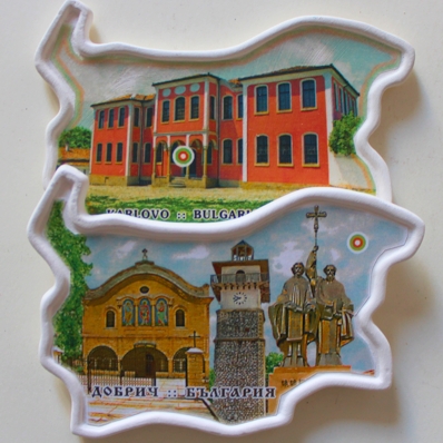 Керамични сувенири "България" /Модел 04-2/. Основите на изделията са керамични. Формата им съответства на географските граници на страната, с габарити 97:67 мм. На гърбовете имат магнити, с необходимата сила за стабилно прикрепване към метални повърхности.