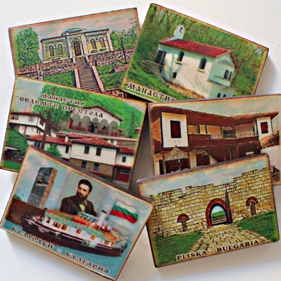 Плочки от естествено дърво и цвят, с размер 58х43x6 мм. и магнити на гърба. Могат да бъдат брандирани със всякакви изображения.