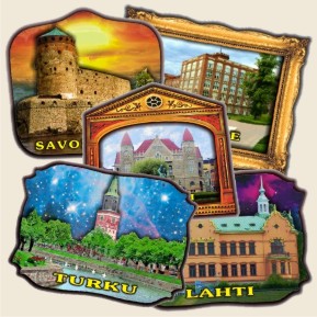 Magneettinen matkamuistoja näkymät Suomen kaupunkien ja maamerkkejä. Kohokuvioitu puu, metalli, keraaminen matkamuistoja, valokuvia tarjoaa asiakkaille. Vapaa visualisointi ja suunnittelu.